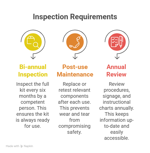 Many organisations also include a fire blanket, first aid kit, and lock-out/tag-out device to support rescue and isolation procedures.