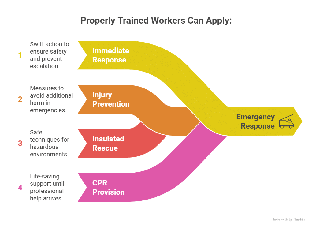 • Proper rescue training dramatically improves outcomes in electrical emergencies by enabling workers to act quickly, isolate danger, and provide CPR if the casualty has suffered shock or cardiac arrest.