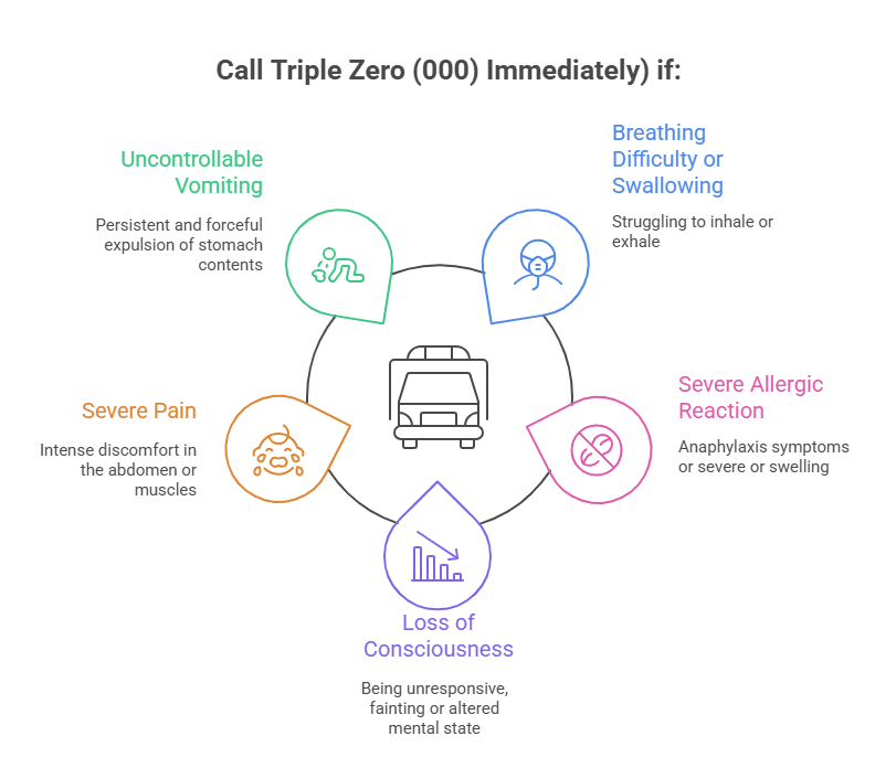 Emergency Contacts: Triple Zero (000) or Poisons Information Centre 13 11 26 | Call if symptoms worsen |
