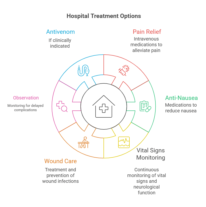 Hospital treatment focuses on pain management, symptom monitoring, and supportive care while the body processes the spider venom naturally. Most patients with redback spider bites do not require hospital admission.